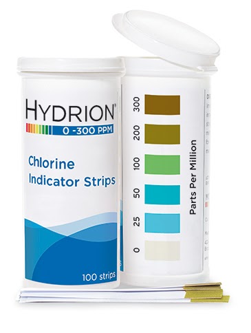 Tiras reactivas de cloro Hydrion 0-300 miden la concentración del cloro libre en soluciones desinfectantes. La tabla de colores tiene coincidencias en 0-25-50-100-200-300 ppm (partes por millón).